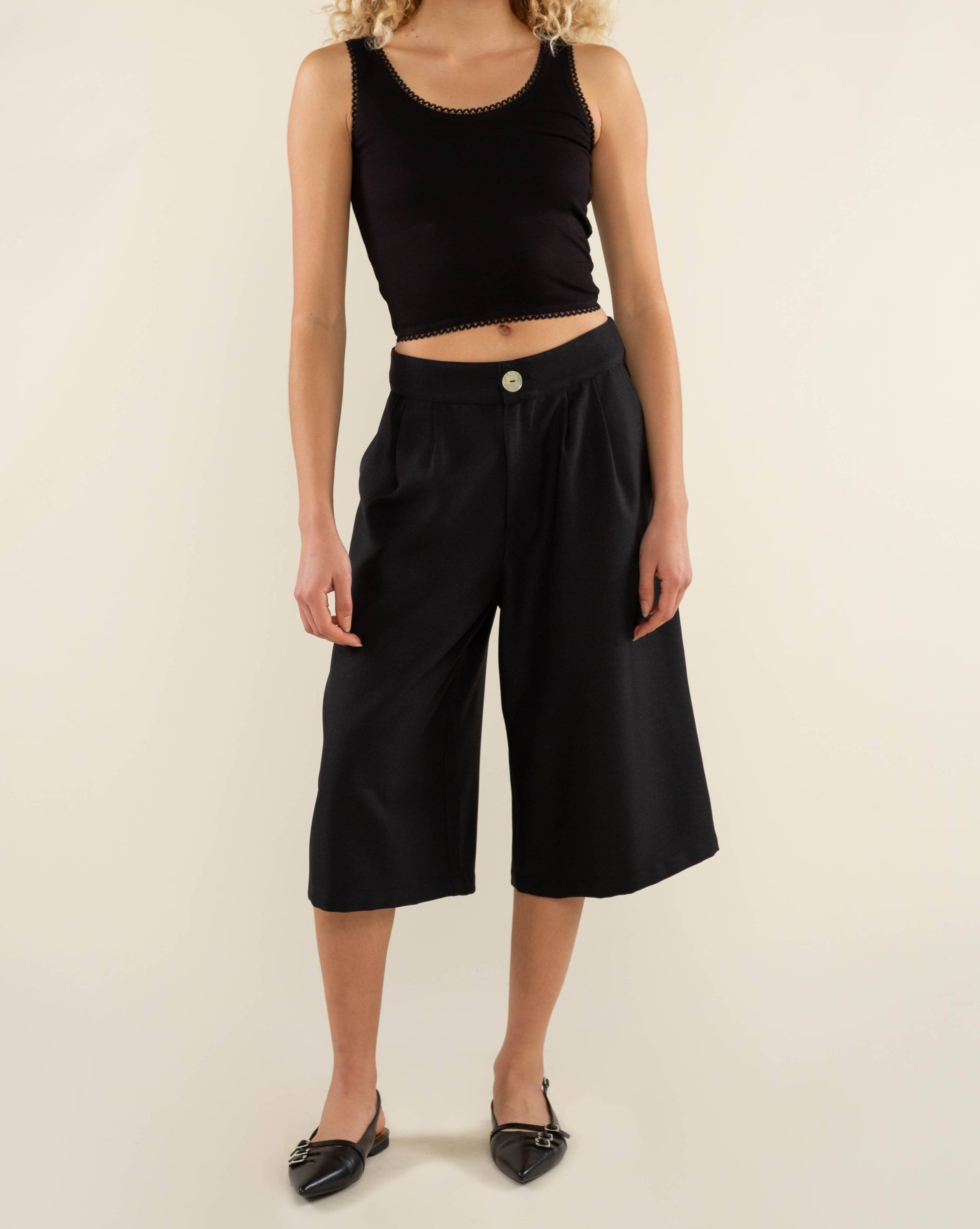Cropped basic tank with scallop elastic trim at the neck, armhole, and hem.